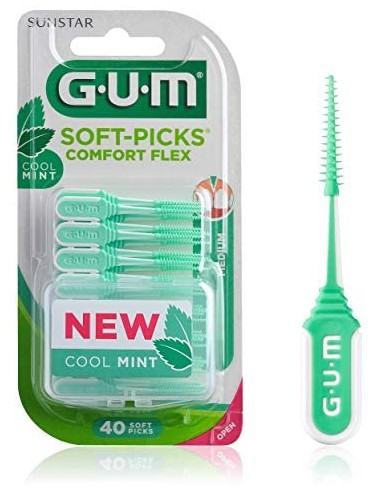 La limpieza interdental es esencial para mantener las encías y los dientes sanos. Los innovadores palillos interdentales GUM SOFT-PICKS COMFORT FLEX MINT y sus suaves filamentos retiran eficazmente la placa de los espacios entre los dientes mientras cuidan las encías. Además, son los únicos con un refrescante sabor a menta.\r\n\r\nLos interdentales GUM SOFT-PICKS COMFORT FLEX MINT te permiten llegar con mayor facilidad a los espacios difíciles de alcanzar. Su agarre ancho y el cuello flexible aportan una mayor comodidad y control. El sabor a menta fresca de sus filamentos proporciona una experiencia de higiene muy agradable y refrescante.\r\n\r\nEstos palillos interdentales también son ideales si tienes espacios interdentales pequeños o intermedios, puentes o un aparato de ortodoncia.