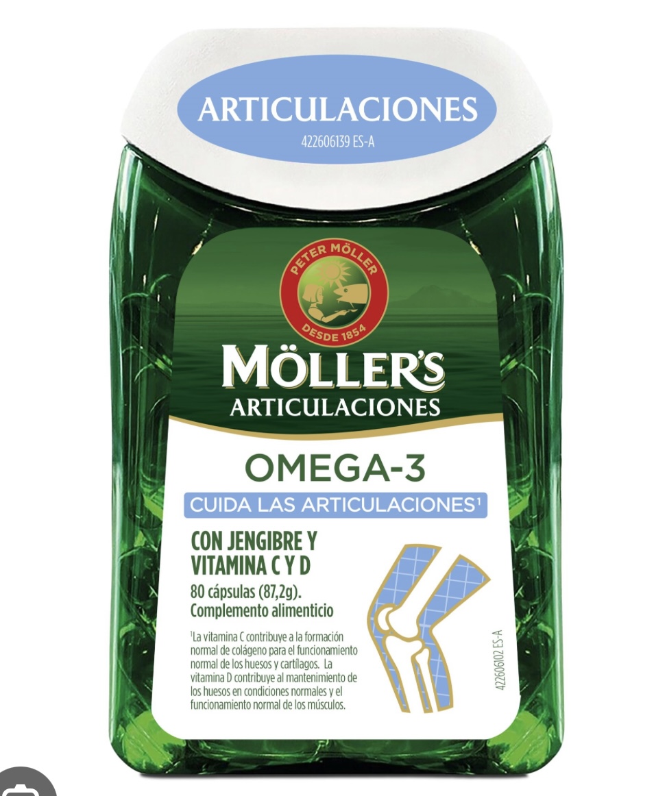 Möller’s Articulaciones contiene omega-3 altamente concentrado, jengibre, vitamina C y D, que cuidan las articulaciones. La vitamina C contribuye a la formación de colágeno, importante para el funcionamiento normal del cartílago. La vitamina D ayuda a mantener la estructura ósea y la función muscular normal. Se trata de factores importantes para las articulaciones.\r\n\r\nMöller’s Articulaciones es una composición única de aceite de pescado altamente concentrado (66%), rico en ácidos grasos omega-3 EPA y DHA, jengibre, vitamina C y vitamina D.\r\n\r\nLa dosis diaria recomendada es de 2-6 cápsulas. Möller’s Articulaciones cubre sus necesidades diarias de omega-3 y aporta 900-2700 mg de omega-3 por cada 2-6 cápsulas.
