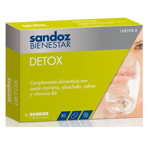 SANDOZ BIENESTAR DETOX es un complemento alimenticio que contiene extracto de cardo mariano (Silybum marianum L.), alcachofa (Cynara scolymus L.), colina y vitamina B6. El cardo mariano es una planta de la cual se extrae la silimarina y es tradicionalmente utilizada para el cuidado y el buen funcionamiento del hígado. La alcachofa favorece la eliminación de líquidos y contribuye a la producción normal de bilis en el hígado. La bilis es esencial en la digestión de las grasas. La colina, perteneciente al grupo de las vitaminas B, contribuye a mantener la función hepática normal y la vitamina B6 contribuye a la síntesis normal de la cisteína, que es un aminoácido importante para la protección y el buen funcionamiento del hígado, así como el drenaje del sistema linfático.